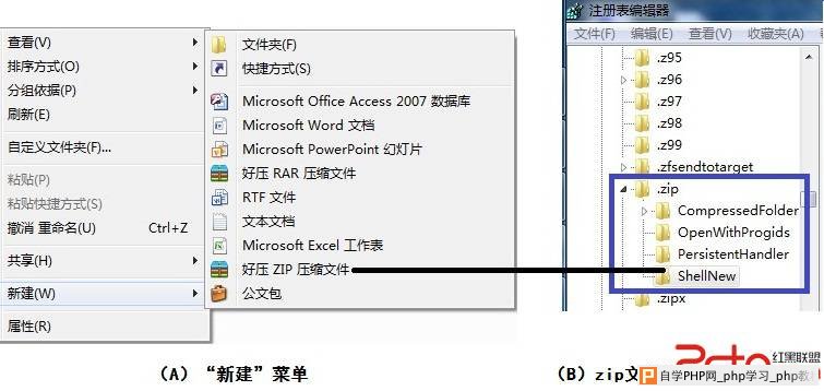 ![]() 图2 "新建"菜单与注册表中的ShellNew子键