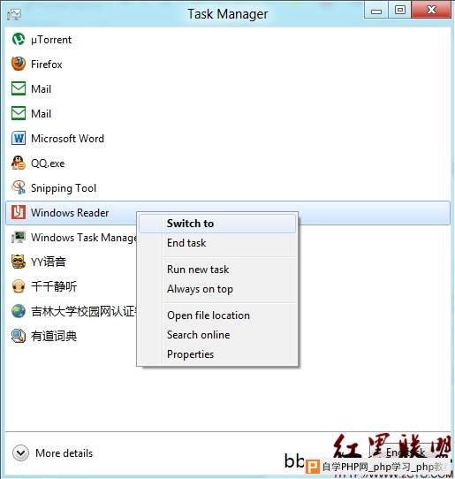 Windows 8中的任务管理器界面看起来更加简洁,而且对“无响应”的程序给出的提示十分显眼。右键惨淡中添加了“在线搜索”功能以及对文件的操作,使使用起来更加方便。