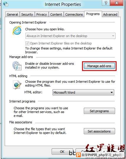 ![]() 选择Programs标签→Manageradd-ons(管理加载项)中进行设置。