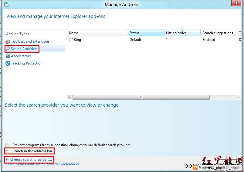 ![]() 接下来在弹出的窗口选择“SearchProviders”(搜索提供商),在右侧中可以看到可用的搜索引擎。若没有可以点击下面的“Findmore search provides”(更多搜索提供商),注意此时取消“search