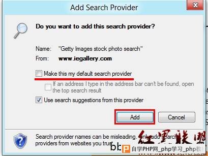![]() ![]() 点击添加。当然,如果想要将该引擎设置为默认引擎可以勾选上方“Makethis my default search provider”。