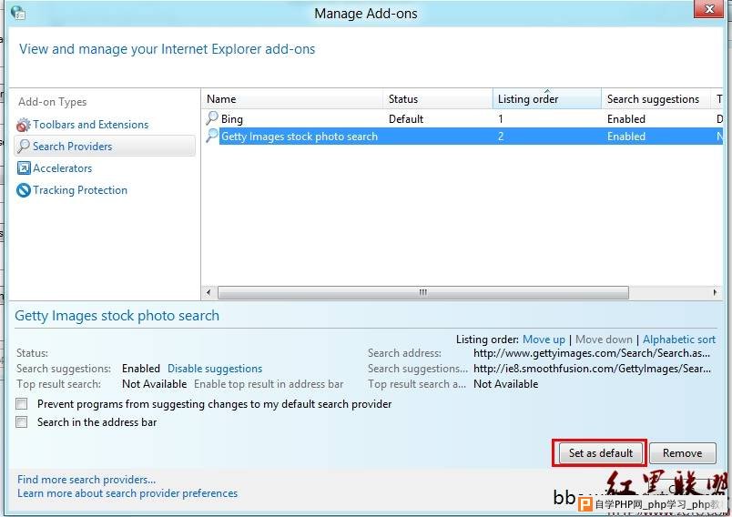 ![]() 添加后回到“管理加载项”界面,选中添加的搜索引擎,点击“Setas default”(设置为默认)即可。