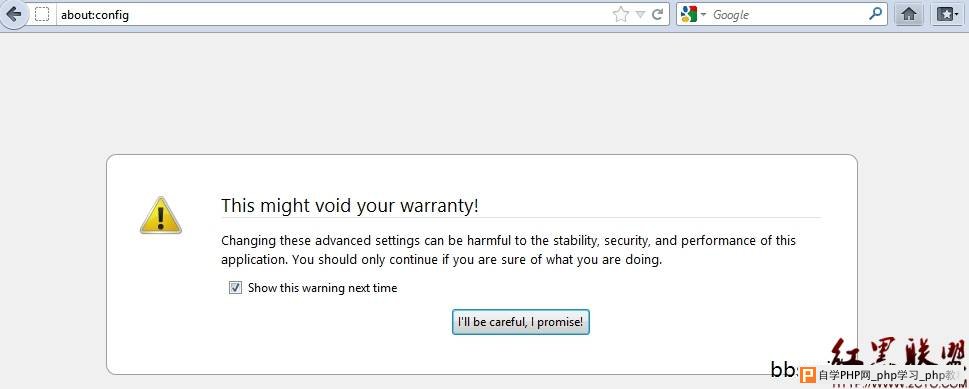 在FireFox地址栏输入“about:config”进入设置界面,首先会弹出提示,看到界面,除了关闭该标签,只剩下我们可以点击的唯一按钮,没有别的选项。