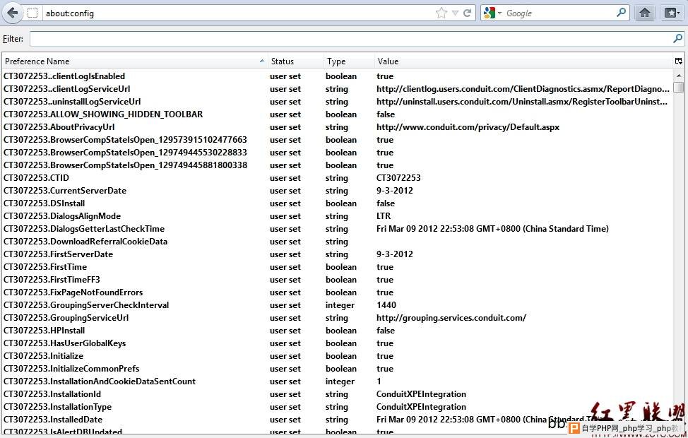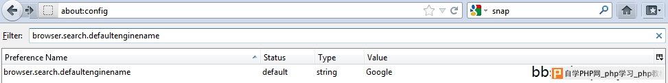 ![]() 在Flitter(筛选器)中输入关键字“browser.search.defaultenginename”后只会剩余一个设置选项。其实关键字随着输入,就可以看到设置项的变化,完全不用输入这么多=。-