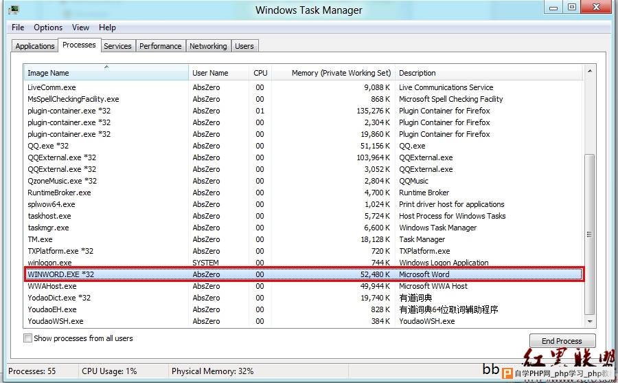 ![]() 而在传统的任务管理器中,所能找到的进程只有winword.exe,不能查看到那个是我们正在编辑的文档,那个是我们需要结束的文档。一旦结束进程,则全部关闭。