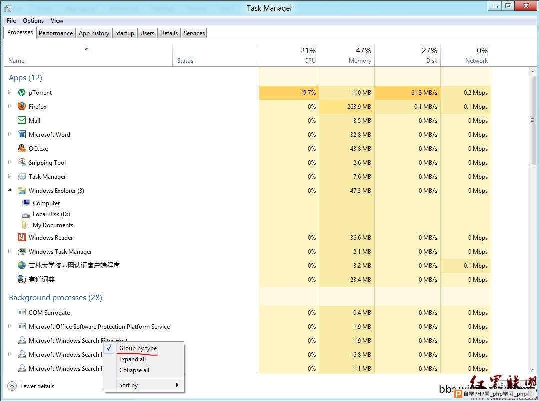 ![]() 无论是否取消“Groupby type”选项,在新版的任务管理器中给出的进程都是按照应用程序进行分类的。相比较于之前版的管理器,看起来更加直观。 www.2cto.com