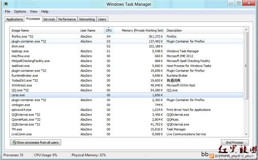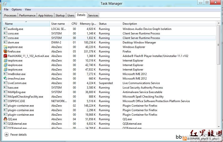 ![]() 如果喜欢传统的界面,可以在Detail标签下进行查看,还是比较相似的,或者说,是更加的完善,除了程序的进程外,还列出了系统进程和本地服务,同时添加了状态一栏,方便我们查看。