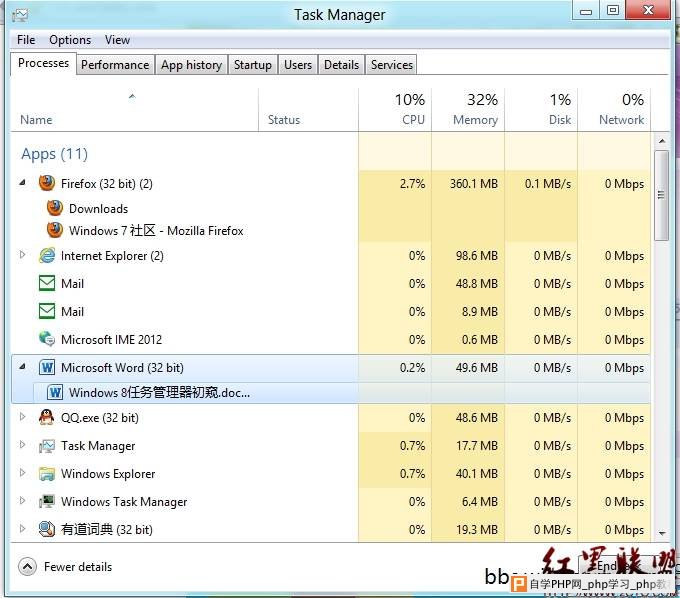 点下“Moredetails”, www.2cto.com 可以看到一个全新的界面。相比于清爽的简化界面,补充出来的内容不亚于传统的任务管理器,而且界面更加亲民。