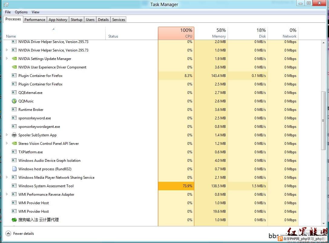 此外,使用率不同,标注的背景颜色也不同。颜色越深,也就越耗费系统资源。(上图是在运行Windows评估的时候进行的截图。)此时,可以看到明显的颜色差别(包括资源占用高的进程和正在耗费的资源种类)。