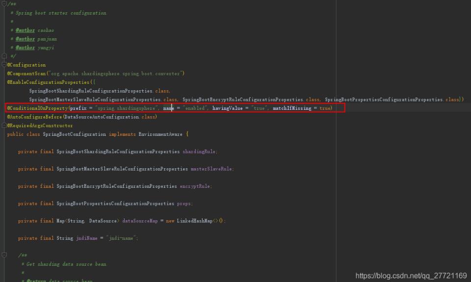 }[object Object] 四、其他校验规则@NotBlank: 判断字符串是否为null或者是空串(去掉首尾空格)。 @NotEmpty: 判断字符串是否null或者是空串。 @Length: 判断字符的长度(最大或者最小) @Min: 判断数值最小值 @Max: 判断数值最大值 @Email: 判断邮箱是否合法 补充知识:控制Configuration是否生效,使用Springboot中@ConditionalOnProperty注解 介绍 @ConditionalOnProperty注解的作用是来控制Configuration是否生效 通过其两个属性name以及havingValue来实现的,其中name用来从application.properties中读取某个属性值。 matchIfMissing来控制默认值 如果值不为空,则将该值与havingValue指定的值进行比较,如果一样则返回true;否则返回false。 如果返回值为false,则该configuration不生效;为true则生效。 使用 shardingjdbc中可以控制是否启用,这样可以针对某个配置来启动数据源,完全不影响代码实现,想完成这个功能就要用到Stringboot提供的注解@ConditionalOnProperty