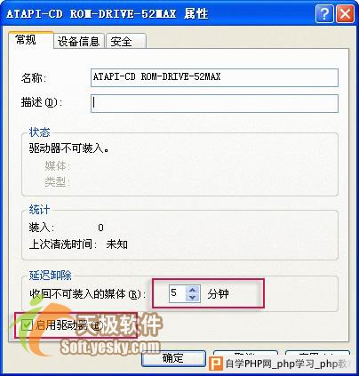 5. 在属性对话框中,首先确保“启用驱动器”为选中状态,然后再将“延迟卸除”中默认的5分钟(图2)改为0分钟。