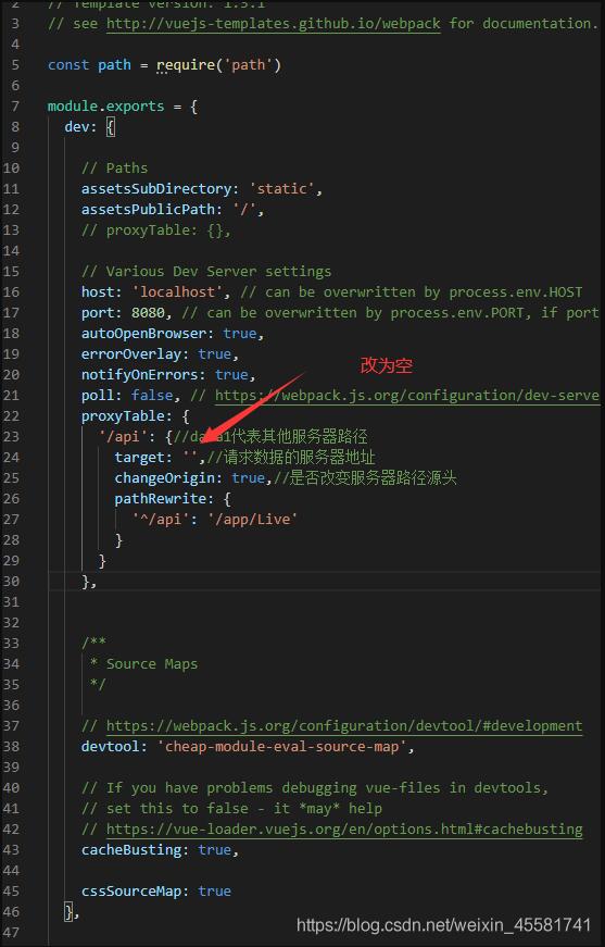 2、修改config下index.js文件 cssSourceMap: true 改为 cssSourceMap: false productionSourceMap: true 改为 productionSourceMap: false, productionGzip: true, 改为 productionGzip: false, 接着重新打包~ 补充知识:vue项目打包后请求不到数据的问题 为什么我们在开发vue项目的时候需要配置反向代理,原因是因为我们本地开发的时候会出现跨域的问题, 这个时候就需要反向代理来帮我们处理跨域的问题,但是有些开发者在开发完项目的时候,会直接打包, 直接打包的话就会出现问题,请求不到数据,是因为我们打包后的项目根本就不会出现跨域了,因为我们在开发的时候走的是本地8080端口,所有才有跨域, 打包完之后不用走本地端口所有就不会出现跨域了,所以我们在打包之前要先把我们的反向代理给注释掉,这样才不会出现数据请求出错的问题。