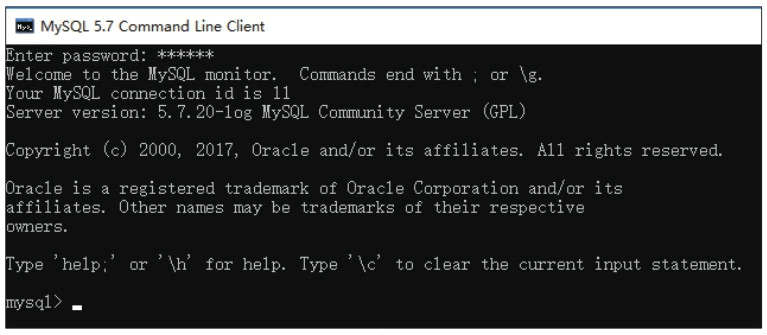 MySQL 安装完成后,用户可以通过 MySQL 5.7 Command Line Client 程序验证 MySQL 是否安装成功。