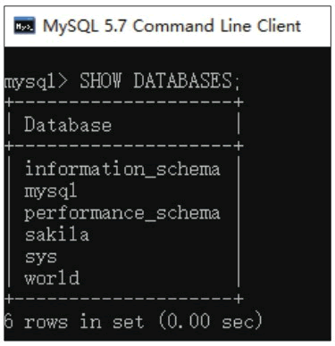 在 MySQL 5.7 Command Line Client 程序中输入简单命令,如 SHOW DATABASES,显示当前的数据库列表,如图所示。