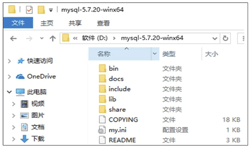 步骤 1):将 MySQL 免安装压缩文件解压到一个文件夹,如 D:\mysql-5.7.20-winx64\,如图所示。
