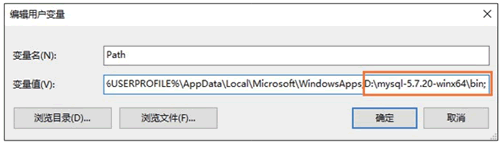 步骤 2):配置环境变量,在系统变量 path 后面追加 D:\mysql-5.7.20-winx64\bin,如图所示。