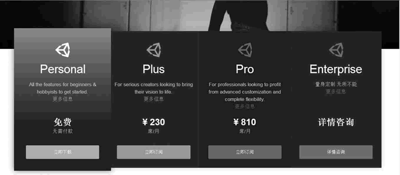 在下载页面中有 Unity 版权的一些信息。在 Unity 的官方网站的下载页面可以看到4个版本,分别是Personal、Plus、Pro、Enterprise,如下图所示。单击 Personal 下的“立即下载”按钮。