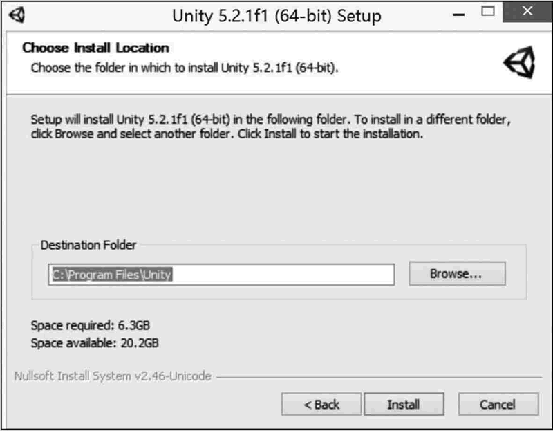 步骤 5):进入 Choose Install Location 界面,单击 Browse 按钮选择 Unity 的安装路径,默认安装在 C:\Program Files\Unity 中,选好路径后单击 Install 按钮进行安装,如下图所示。