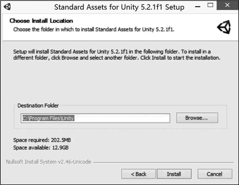 步骤 11):进入 Choose Install Location 界面,单击 Browse 按钮选择 Unity 资源的安装路径,默认安装在 C:\Program Files\Unity 中,选好路径后单击 Install 按钮进行安装,如下图所示。