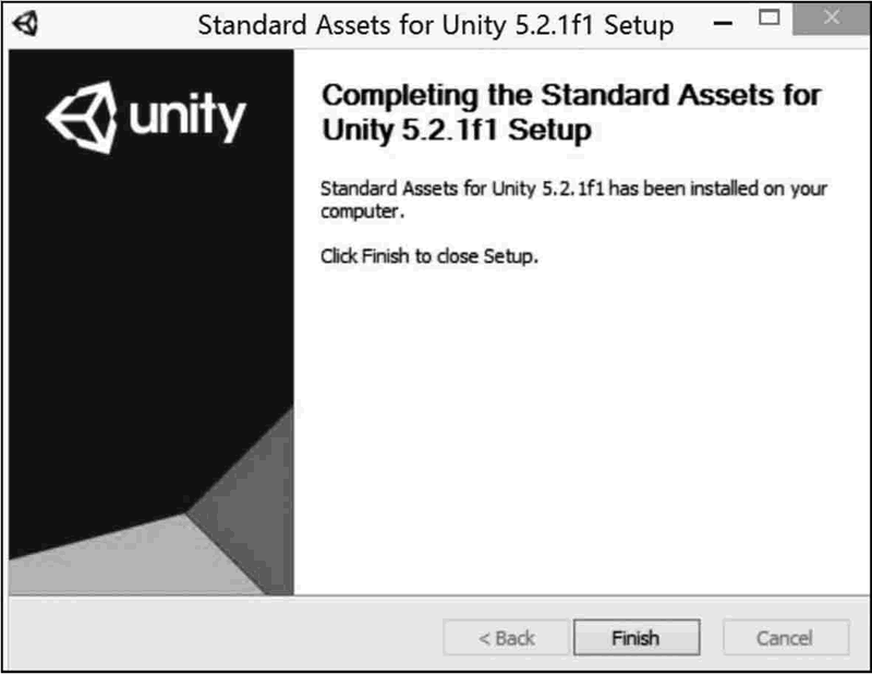 步骤 7):当滚动条进到 100% 时将会转到 Finish 界面,单击 Finish 按钮。接下来安装 Unity 资源,双击 UnityStandardAssetsSetup 图标,如下图所示。