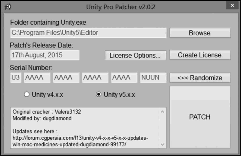 步骤 12):将 Patcher 置于安装目录的 Editor 文件夹下,右击该文件夹,以管理员权限运行,单击 Browse 按钮找到 Editor 文件夹,选择 Unity 5.0 后,单击 PATCH 按钮,如下图所示。