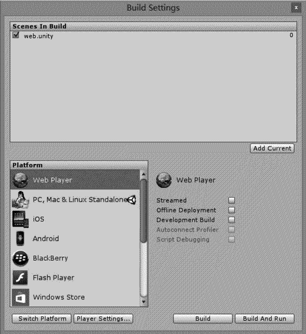 新建的项目默认发布到 Web 平台,单击 Add Current 按钮,将刚刚保存的场景添加到发布窗口中,然后选中发布窗口中的 Web Player(网页播放器)选项,接下来单击 Switch Platform(交换平台)按钮启动该平台。