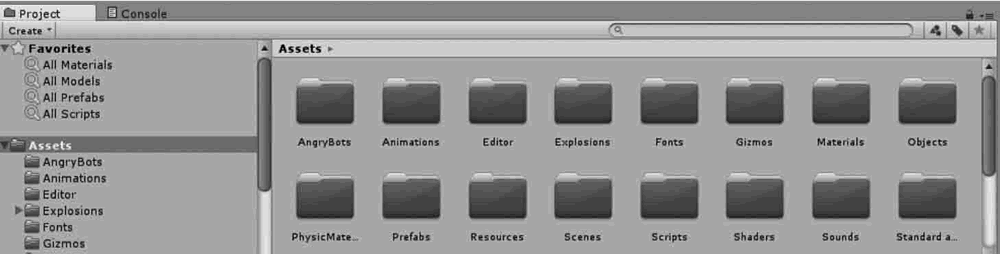 每个 Unity 3D 的项目包含一个资源文件夹,其内容将呈现在 Project 视图中,如下图所示。这里存放着游戏的所有资源,例如场景、脚本、三维模型、纹理、音频文件和预制组件。