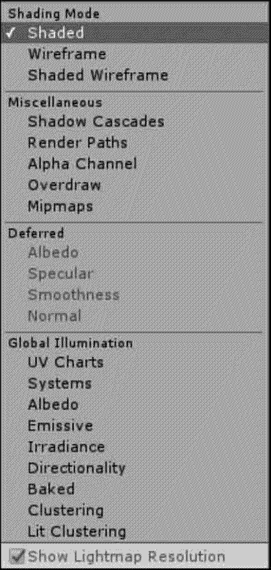 | Shaded | 着色模式(默认模式) | 所有游戏对象的贴图都正常显示 |