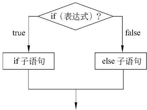 条件语句 if…else 完成程序流程块中分支功能:如果其中的条件成立,则程序执行紧接着条件的语句或语句块;否则程序执行 else 中的语句或语句块。其流程图如下图所示。