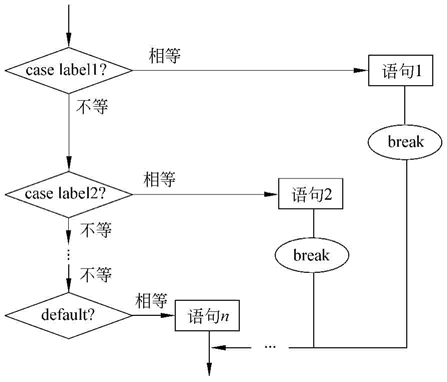 分支语句 switch 可以根据一个变量的不同取值采取不同的处理方法。如果表达式取的值同程序中提供的任何一条语句都不匹配,将执行 default 中的语句,如下图所示。