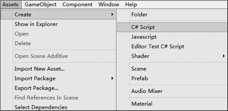 首先执行 Assets→Create→C#Script 或 JavaScript 菜单命令创建一个空白脚本,将其命名为 Move,这里我们以 C# Script 为例如下图所示。