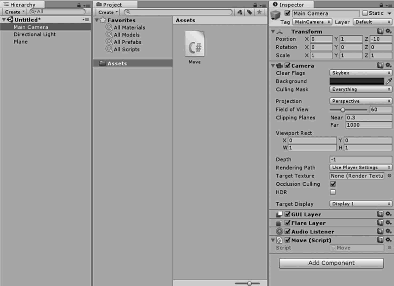 脚本创建完成后,需要将其添加到物体上。在 Hierarchy 视图中,单击需要添加脚本的游戏物体 Main Camera(主摄像机),然后执行 Component→Script→Move 菜单命令,如下图所示,Move 脚本就链接到了 Main Camera 上。