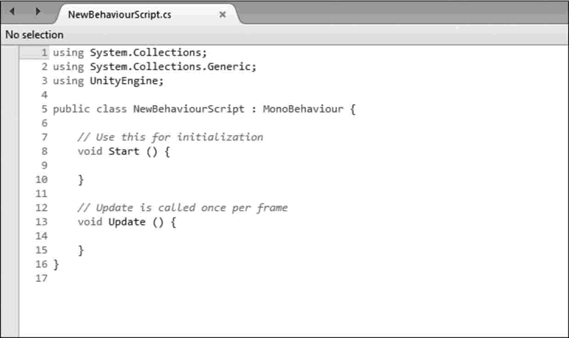 通过在 Unity 中创建 C# 脚本,系统模板已经包含了必要的定义,如图下图所示。