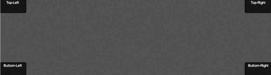 步骤 6):单击 Play 按钮进行测试,Game 视图的 4 个角出现了 4 个标题分别为 Top-Left、Top-Right、Bottom-Left、Bottom-Right 的按钮组件,如下图所示。