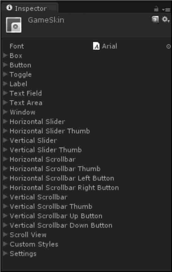 创建一个图形用户界面皮肤,在菜单栏中执行 Assets→Create→GUI Skin 命令,创建后的 GUI Skin 如下图所示,具体参数如下表所示。