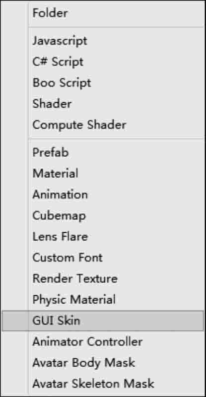 步骤 3):单击 Project 视图下拉三角,创建 GUI Skin,如图下图所示。