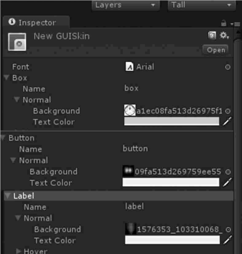步骤 4):在 Inspector 面板中修改 GUI Skin 参数,分别设置 Box、Button、Label 样式,如下图所示。