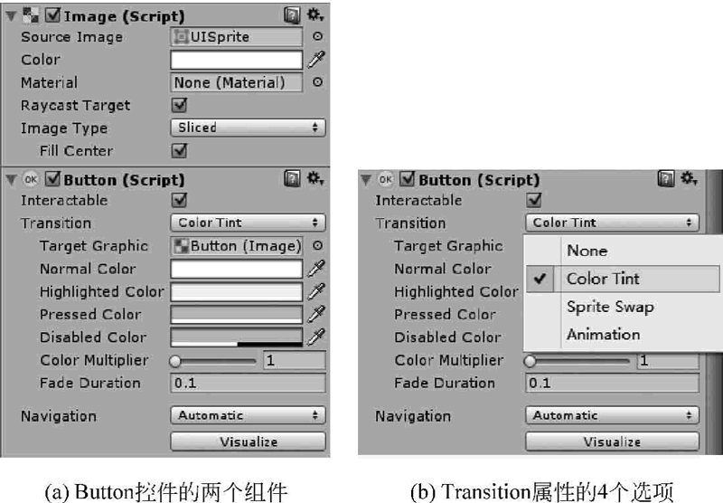除了公共的 Rect Transform 与 Canvas Renderer 两个 UI 组件外,Unity 3D Button 控件还默认拥有 Image 与 Button 两个组件,如下图(a)所示。