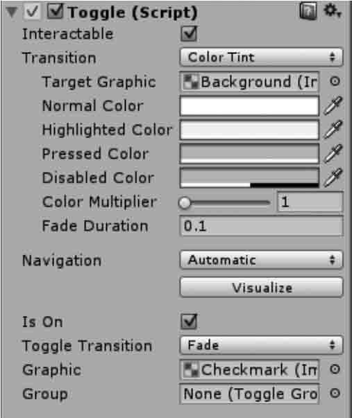 Background 是一个图像控件,而其子控件 Checkmark 也是一个图像控件,其 Label 控件是一个文本框,通过改变它们所拥有的属性值,即可改变 Toggle 的外观,如颜色、字体等。