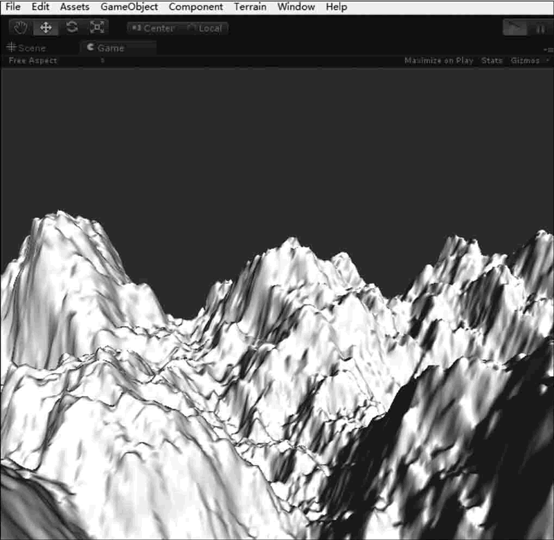 本案例通过 Photoshop 中制作好的高度图在 Unity 3D 中创建一个简单的地形,在地形参数列表里设置导入高度图的信息,导入的高度图地形效果如下图所示。