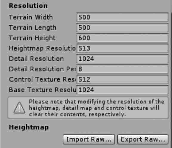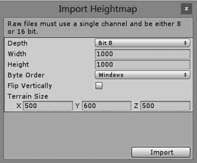 Unity 提供了为地形导入、导出高度图的选项。单击 Settings tool 按钮,找到标记为 Import RAW 和 Export RAW 的按钮。这两个按钮允许从标准 RAW 格式中读出或者写入高度图,并且兼容大部分图片和地表编辑器。