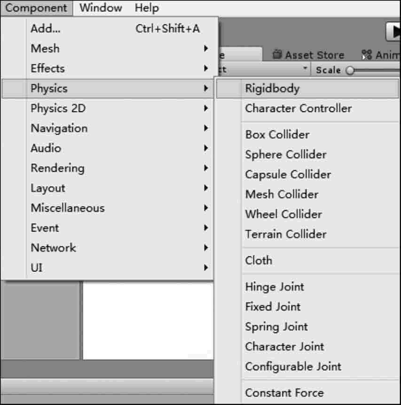 如下图所示,在 Unity 3D 中创建并选择一个游戏对象,执行菜单栏中的 Component→Physics→Rigidbody 命令为游戏对象添加刚体组件。