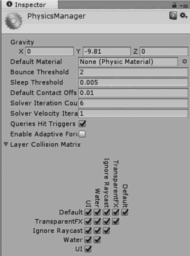 在 Unity 3D 中执行 Edit→Project Settings→Physics 命令可以打开物理管理器,如下图所示。