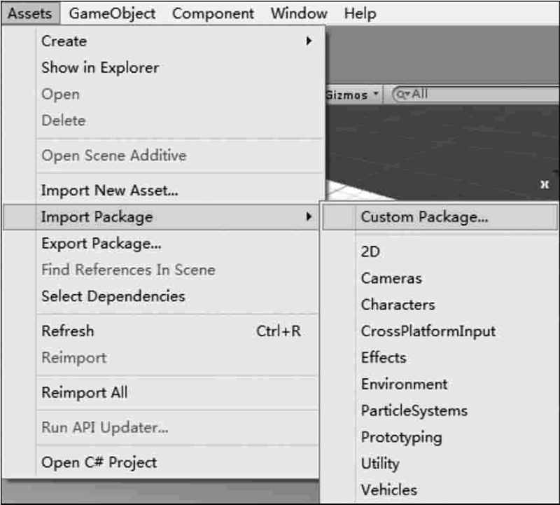 步骤 5):执行 Assets→Import Package→Custom Package 命令添加第一人称资源,如下图所示。