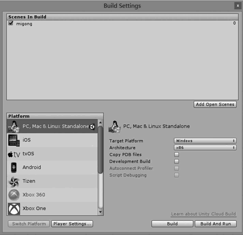 步骤 14):将场景添加到 Build Settings 中,如下图所示。