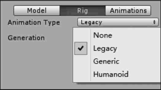 非人形动画的使用方法是:在 Assets 文件夹中选中模型文件,在 Inspector 视图中的 Import Settings 属性面板中选择 Rig 标签页,单击 Animation Type 选项右侧的列表框,选择 Generic 或 Legacy 动画类型即可。