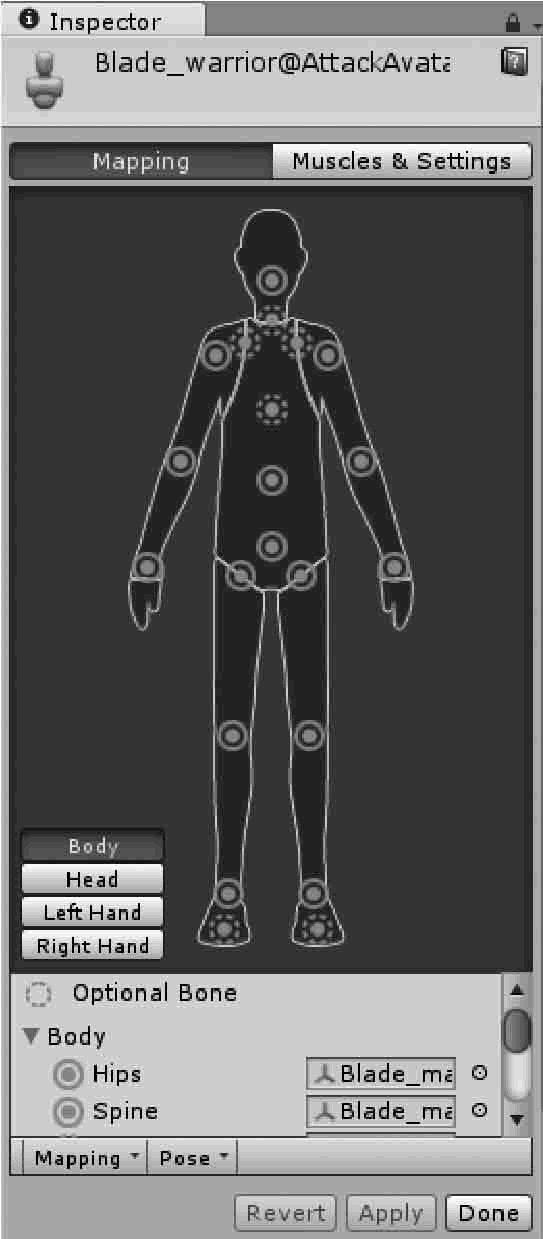 要使用 Humanoid(人形动画),单击 Animation Type 右侧的下拉列表,选择 Humanoid,然后单击 Apply 按钮,Mecanim 动画系统会自动将用户所提供的骨架结构与系统内部自带的简易骨架进行匹配,如果匹配成功,Avatar Definition 下的 Configure 复选框会被选中,同时在 Assets 文件夹中,一个 Avatar 子资源会被添加到模型资源中。配置Avatar