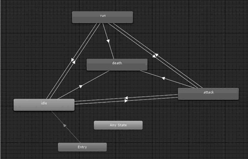 状态机对于动画的重要性在于它们可以很简单地通过较少的代码完成设计和更新。每个状态都有一个当前状态机在那个状态下将要播放的动作集合。这使动画师和设计师不必使用代码定义可能的角色动画和动作序列。