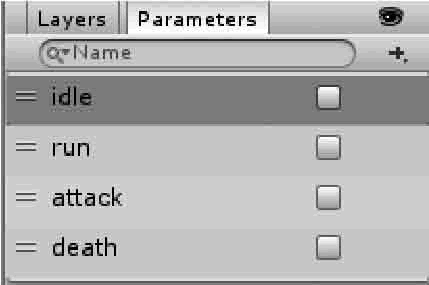 要对过渡条件进行控制,就需要设置过渡条件参数,Mecanim 动画系统支持的过渡条件参数有 Float、Int、Bool 和 Trigger 4 种。
