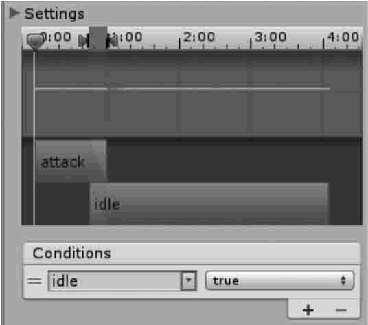 动画状态机之间的箭头标示两个动画之间的连接,右击一个动画状态单元,在快捷菜单中执行 Make Transition 命令创建动画过渡条件,然后单击另一个动画状态单元,完成动画过渡条件的连接。